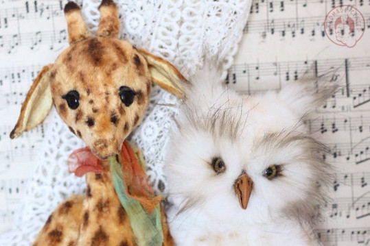 Плюшевая игрушка Жираф по имени Рафик выполнен из винтажного плюша, а в качестве тонировки взято масло. Креплением служат шесть шплинтов. Наполнением является гранулят и опилочки. Стеклянные глазки придают выражению мордочки немного детскости и невинности.