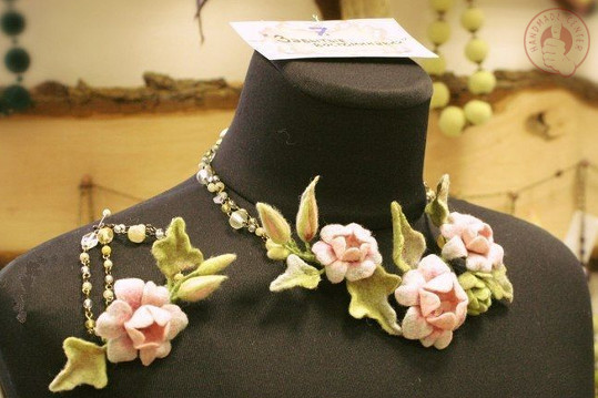 Комплект ручной работы, состоящий из колье и браслета, получил название Забытое воспоминание. Гарнитур выполнен на каркасе в технике сухого валяния. Вся эта красота дополнена стеклянными винтажными бусинами, розовым кварцем и фурнитурой.