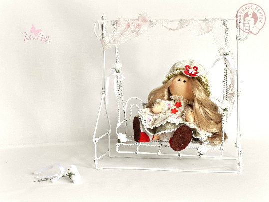 Выполнена из натуральных материалов трикотажа, холлофайбера, украшений, ленточек, ткани хлопка, баттиста, ниток, кружев, кожи.