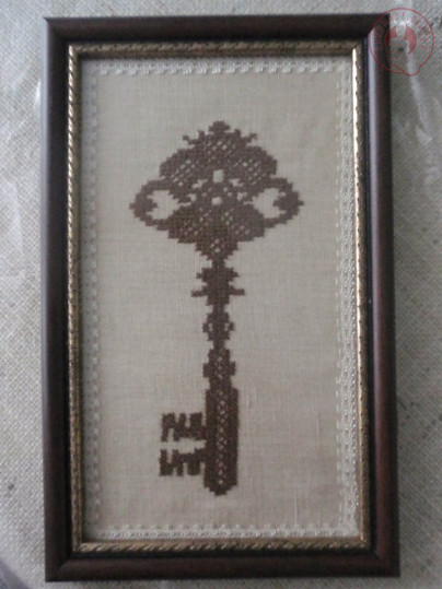 Вышитый ключик на льне мулине DMC в винтажной технике, украшен тонким кружевом, под стеклом.